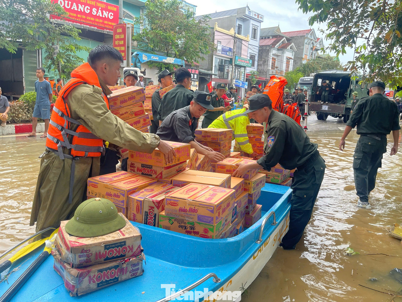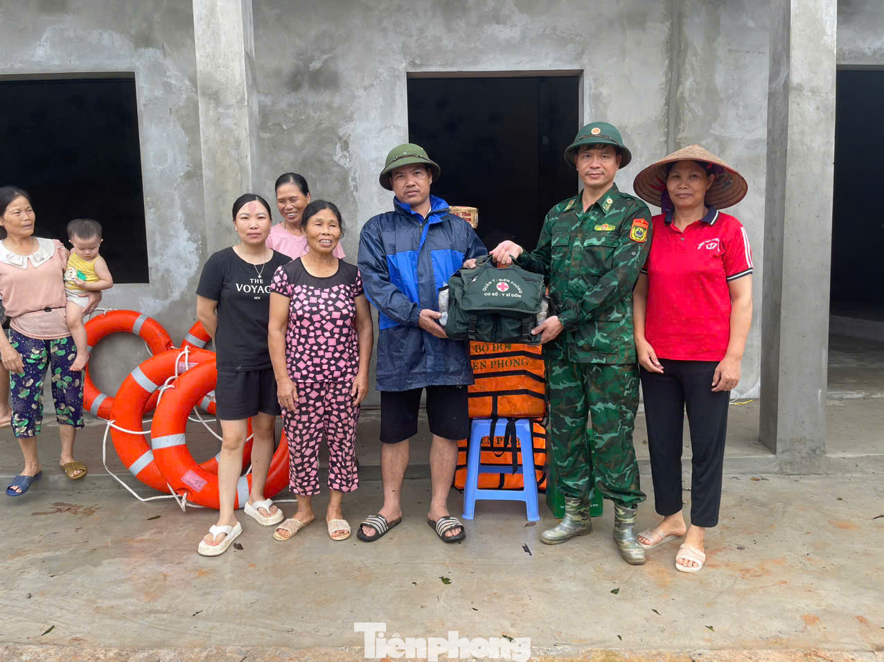 Cán bộ, chiến sĩ Đồn Biên phòng Chi Lăng (Lạng Sơn) tặng mì tôm, nhu yếu phẩm, phao cứu sinh cho nhân dân vùng ngập lụt biên giới Lạng Sơn. Ảnh: Duy Chiến