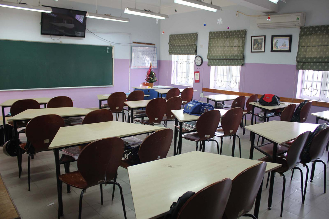 Phòng học được trang trí thoáng đãng đẹp mắt và vô cùng hiện đại với máy điều hòa, tivi,… (Ảnh: nbk.edu.vn)