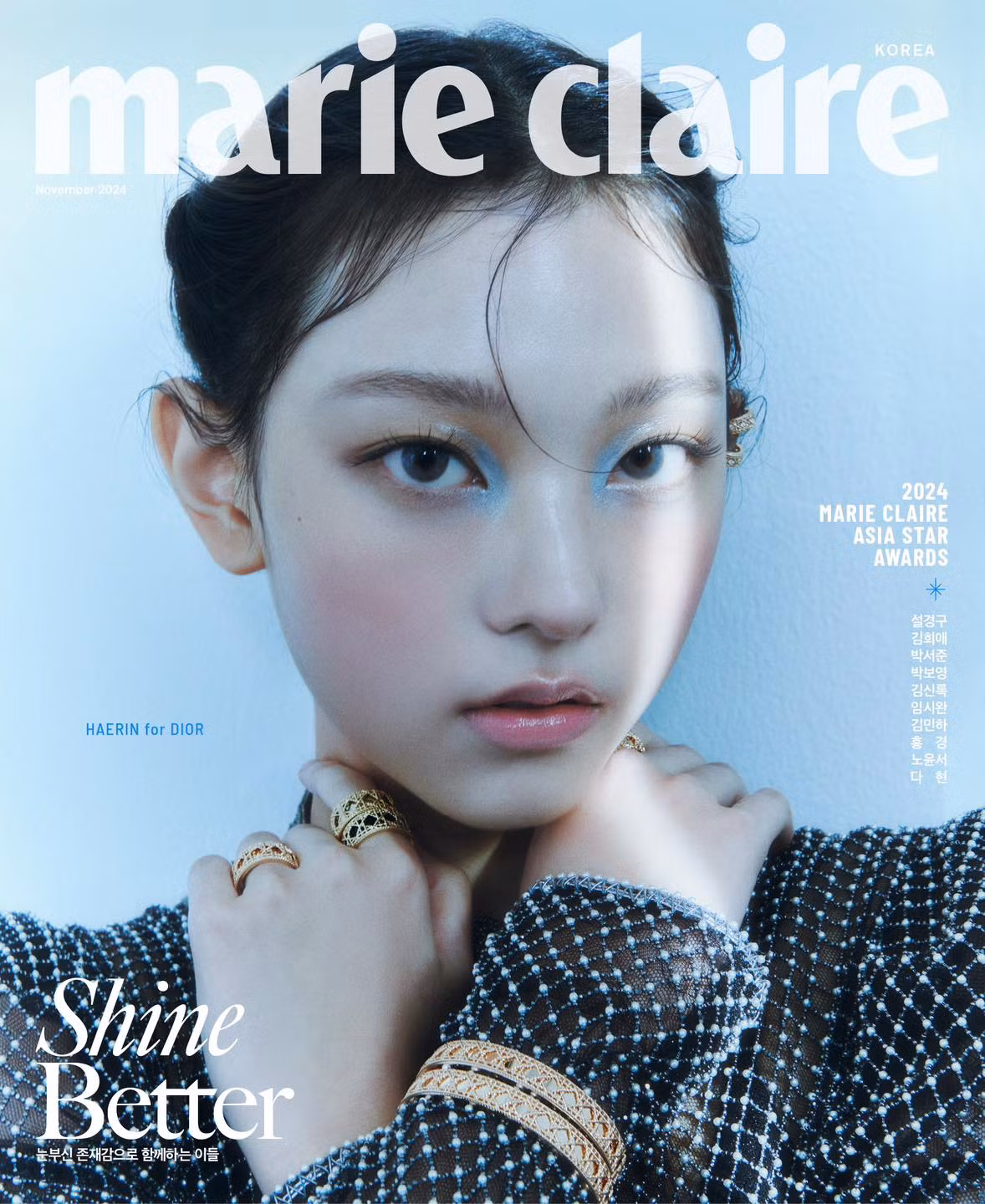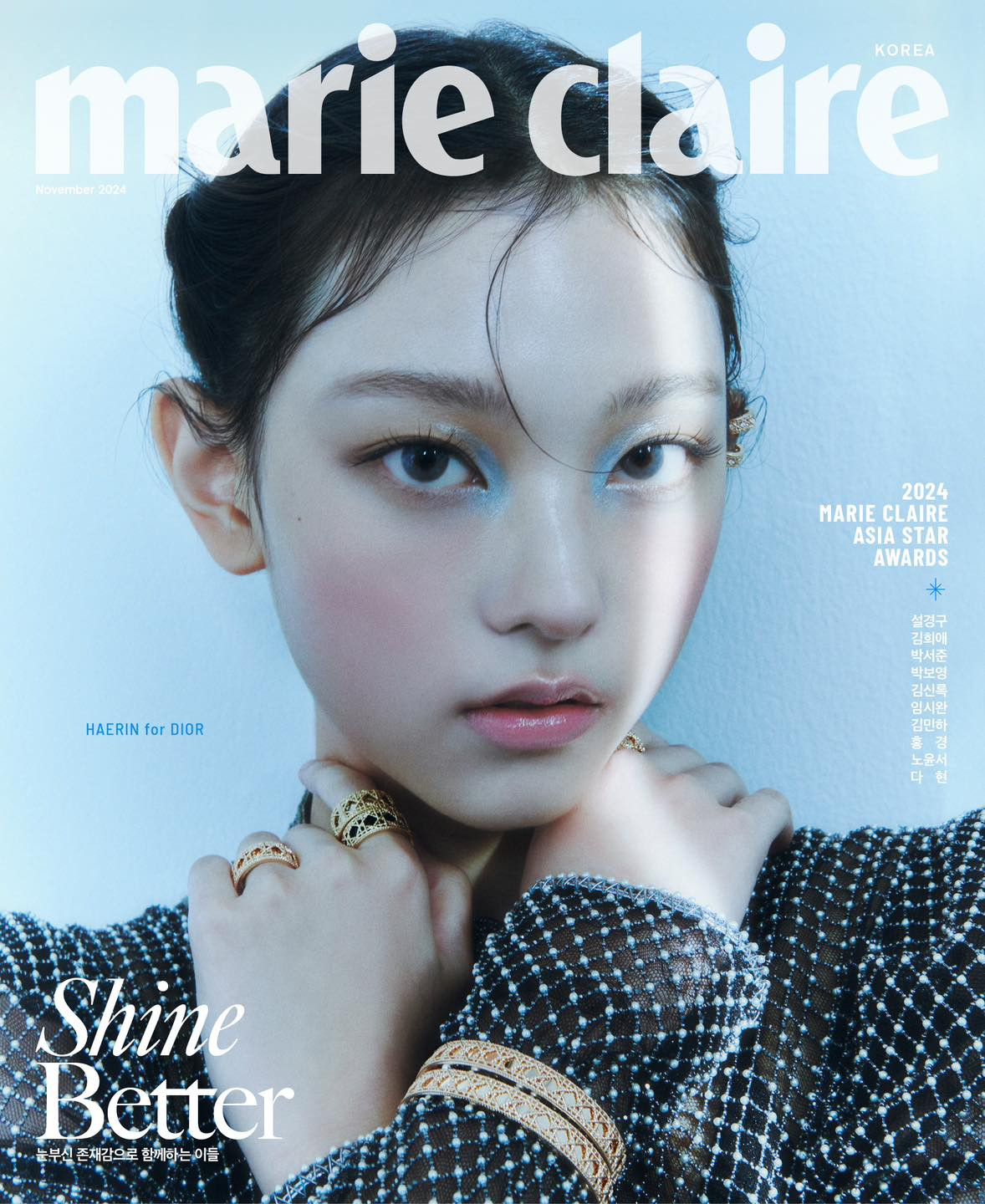 Haerin NewJeans là ngôi sao trang bìa tạp chí Marie Claire Hàn Quốc ấn phẩm tháng 11. Nữ idol sinh năm 2006 đồng hành cùng thương hiệu Dior. Cô diện loạt trang phục đến từ BST Resort 2025 mới ra mắt hồi tháng 6 của nhà mốt Pháp.