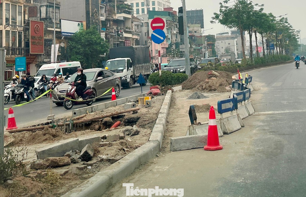 | Hàng rào sắt bị nhổ vừa làm dải phân cách trơ trọi, mặt lổn nhổn hố đào, vừa khiến người đi bộ bất chấp các dòng xe đang lưu thông để băng qua đường ở bất kỳ đâu. |