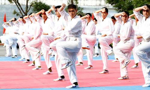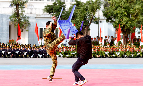 | Các học viên trình diễn các bài võ tổng hợp của lực lượng vũ trang. |