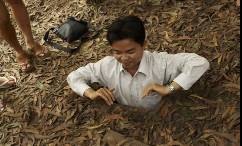 Hướng dẫn viên (cao 1m55 - bằng chiều cao trung bình của các chiến sĩ Giải phóng) làm ví dụ về cách chui vào một đường hầm.
