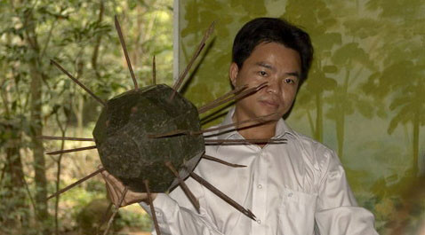 Quả cầu chông sắt này được treo trên cây, sẽ rơi xuống theo một đường vòng cung trúng vào người kích hoạt bẫy.