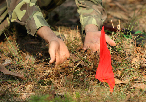 | Sau khi đưa ngòi nổ về tư thế an toàn, mìn được đặt sang một bên và tiến hành cắm cờ màu trắng báo hiệu vị trí đã được tháo gỡ an toàn. |