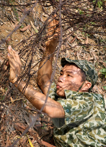 | Chiến sĩ trinh sát Đoàn 113 (Binh chủng Đặc công) vượt qua hàng rào dây thép gai tiếp cận mục tiêu. |
