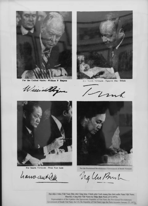 Hai cây bút đã được đoàn Việt Nam sử dụng để ký Hiệp định Paris và Định ước quốc tế công nhận Hiệp định Paris, chiếc xoong nhôm dùng để quấy xi niêm phong bản Hiệp định Paris; cuốn sổ tập hợp 10.000 chữ ký của nhân dân Cuba phản đối chiến tranh và ủng hộ nhân dân Việt Nam.