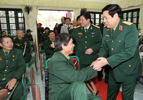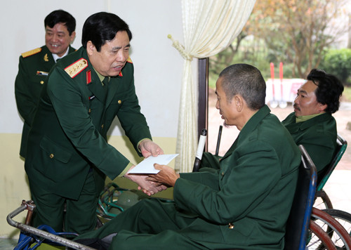 | Đại tướng Phùng Quang Thanh thăm hỏi, động viên thương binh tại Trung tâm điều dưỡng thương binh Duy Tiên. Ảnh: Thái Hà |