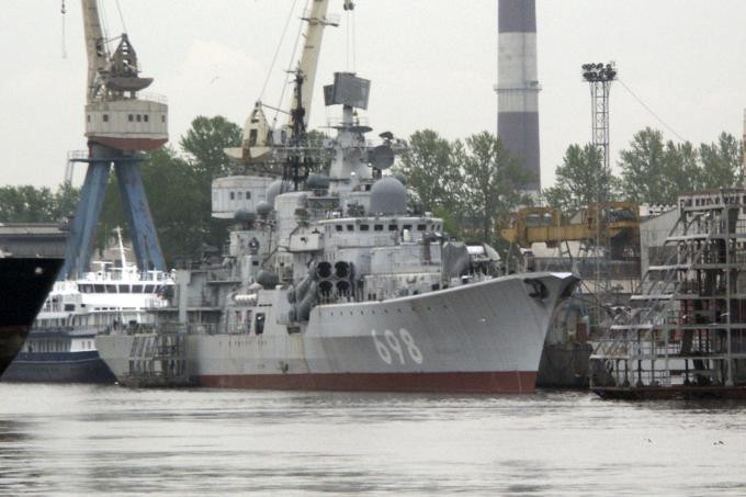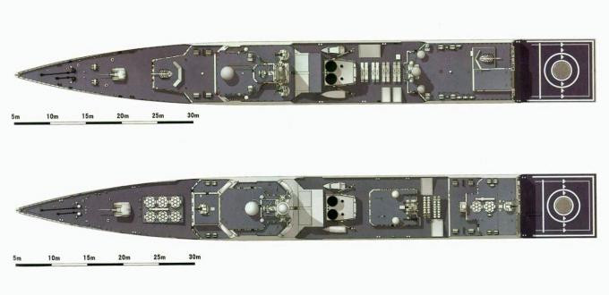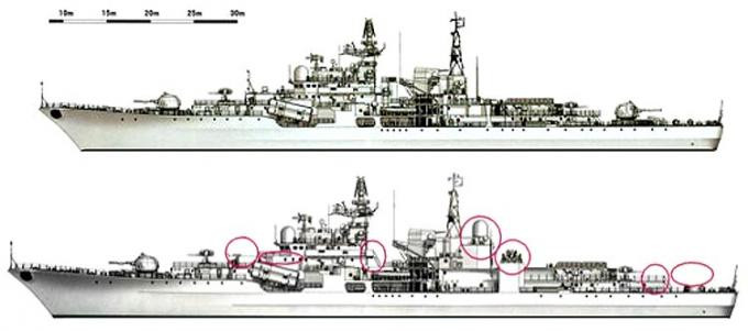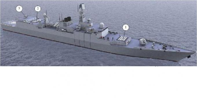 Có thể thấy được rõ ràng: Hệ thống tên lửa phòng không SAM "Reef-M" (ăng-ten được lắp đặt"phân tán") trên cấu trúc thượng tầng boong phía sau, 6 ống phóng SAM "Rif-M" ( mũi tầu - hai ống phóng, và đuôi tầu có bốn ống phóng tên lửa).