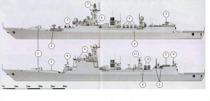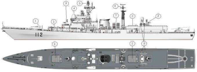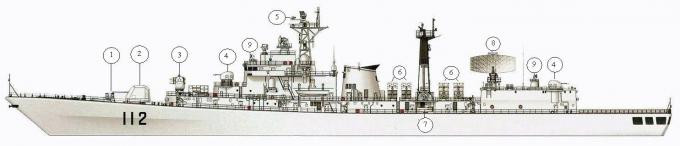 1 - 1х2 100-mm pháo hạm «type 79»; 2 - 1х8 ống phóng tên lửa phòng không SAM «HQ-7»; 3 – Đài radar phát hiện các mục tiêu mặt nước và trên không «type 360»; 4 – Hệ thống điều khiển hỏa lực «type 347G»; 5 – Bệ phóng ngư lôi chống ngầm 1х3 324-mm; 6 – Đài sonar chống ngầm ; 7 - 4х4 dàn phóng tên lửa chống tầu «YJ-82»; 8 – Radar phát hiện mục tiêu trên không và trên biển; 9 –Radar cảnh báo sớm và phát hiện mục tiêu tầm xa «type 517»; 10 - 2х37-mm súng phòng không «type 76А»