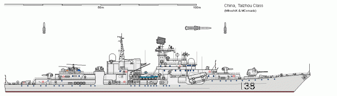 Lượng giãn nước là 7000 tấn; dài/rộng/ngấn nước 155/17/6 м.; Động cơ tuốc bin diesel x 48600 mã lực. + động cơ diesel trạm nguồn.x 8840 mã lực; tốc độ hải hành 29 knots.; dự trữ hải trình 4500 hải lý. ( tốc độ tiết kiệm 15 knots.); thủy thủ đoàn 280 (40 sĩ quan) người; 2 bệ phóng x4 ống phóng tên lửa chống tầu YJ12; 8 bệ phóng x 6 ống phóng tên lửa phòng không thẳng đứng ЗРК HQ-9 hoặc RIF-M; 1 pháo hạm 100-mm; 2 ụ súng tự động х 7 nòng 30-mm АК; 2 bệ phóng х 3 ống phóng ngư lôi chống ngầm; trực thăng KA-28.