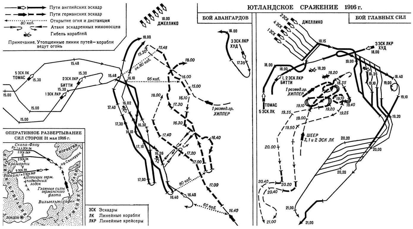 Trận hải chiến Jutland vào cuối tháng 3/1916 giữa hạm đội của Anh và của Đức đã kết thức tư duy chiến lược trận đánh vĩ đại trên biển. Trong trận hải chiến này, người Anh đã mất 14 tầu với trọng tải là 113570 tấn, 6097 thủy thủ hy sinh, 510 bị thương. Người Đức mất 11 chiến hạm với trọng tải là 60250 tấn, 2551 thủy thủ hy sinh, 507 người bị thương. Nhưng trận chiến lớn nhất này không kết thúc bằng sự hủy diệt của Hải quân Anh, và người Đức cũng không chiếm được vị trí thống trị trên biển. Tư duy nghệ thuật chiến dịch kết thúc bằng một trận hải chiến vĩ đại đã mất hoàn toàn giá trị hiện thực của nó.
