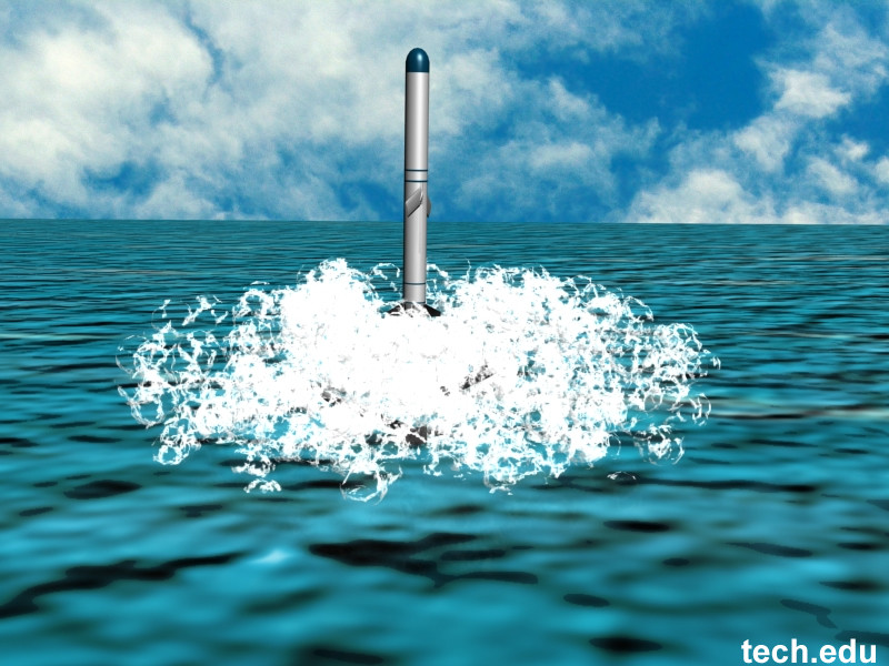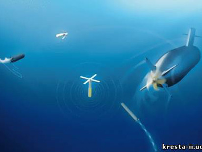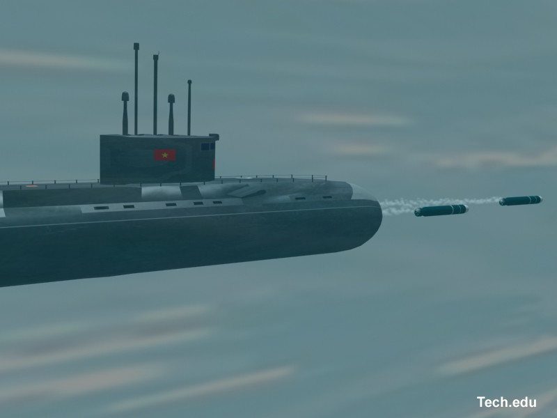 | Tầu ngầm Kilo phóng ngư lôi mang tên lửa Club tiêu diệt chiến hạm địch (mô phỏng 3D). |