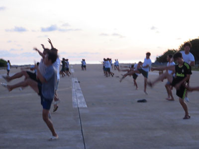 | Sáng sớm, lính đảo Trường Sa Lớn tập thể dục, luyện võ trên đường băng Sân bay Trường Sa Lớn. |
