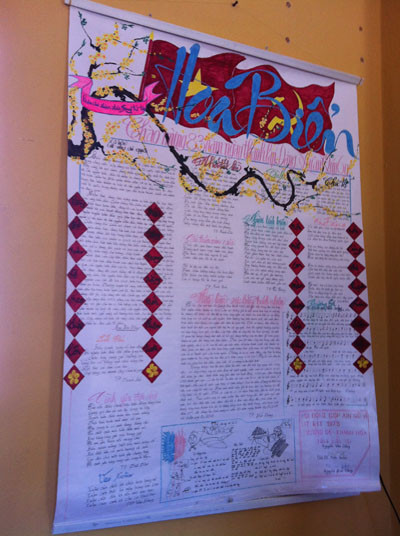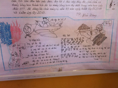 | Các đảo lớn mà PV Tiền Phong đến như Trường Sa Lớn, Song Tử Tây đều có hội trường khá rộng và khang trang, hệ thống trang âm khá tốt để hội họp, sinh hoạt, tổ chức các hoạt động văn nghệ. Trong hội trường treo nhiều tờ báo tường của lính đảo làm nhân dịp các ngày kỷ niệm lớn. Trong ảnh, một tờ báo tường và một số bài trong báo tường của lính đảo Song Tử Tây. |