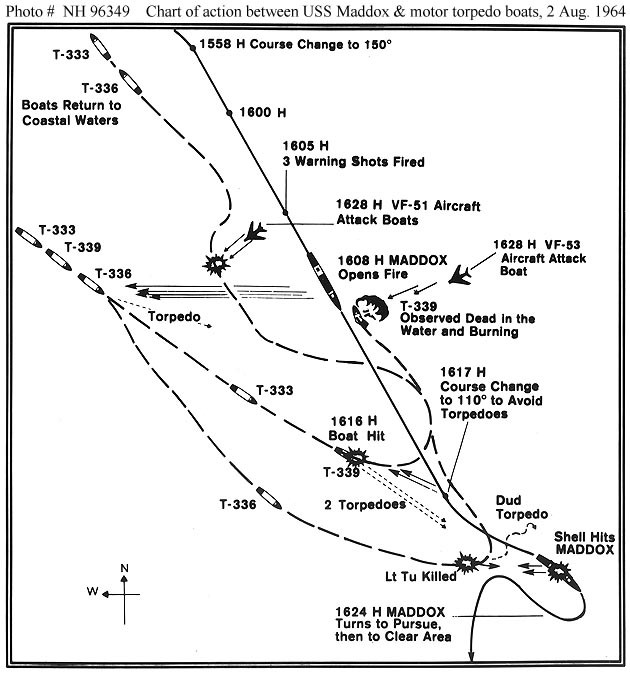 Trong trận đánh đêm 31.7.1964, rạng sáng 1.8, tàu khu trục Maddox khi xâm phạm vùng biển Quảng Bình, sau đó tiến lên phía bắc, điều tra các mạng lưới phòng thủ của Việt Nam ở khu vực đèo Ngang, Hòn Mát, Hòn Mê, Lạch Trường. Ba xuồng phóng lôi 333, 336, 339 nhận nhiệm vụ đánh chặn. Ngày 2.8.1964 3, tàu phóng lôi của Hải quân Việt Nam tiếp cận và tấn công. Tàu khu trục Maddox sử dụng hỏa lực mạnh đánh chặn, tàu 333 nghi binh cho xuồng 336 và 339 công kích. Mỹ sử dụng 5 máy bay hải quân tham chiến, hỏa lực của tàu khu trục và máy bay làm 2 xuồng 336 và 339 bị tổn thất. Tàu phóng lôi 333 quay trở lại, dù bị trúng đạn pháo nhưng vẫn tận dụng tốc độ cao và áp sát khu trục hạm Maddox phóng đạn, bị trúng 1 quả ngư lôi của xuống 333. Tàu Maddox bị cháy và phải rút khỏi vịnh Bắc Bộ.