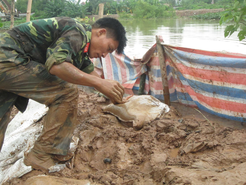 Làm việc liên tục nhưng các đồng chí bộ đội từ sáng chỉ ăn bánh mỳ, và động viên nhau đào đất, đắp mặt đê, ngâm mình trong nước hàng giờ để kiểm tra mặt đê.