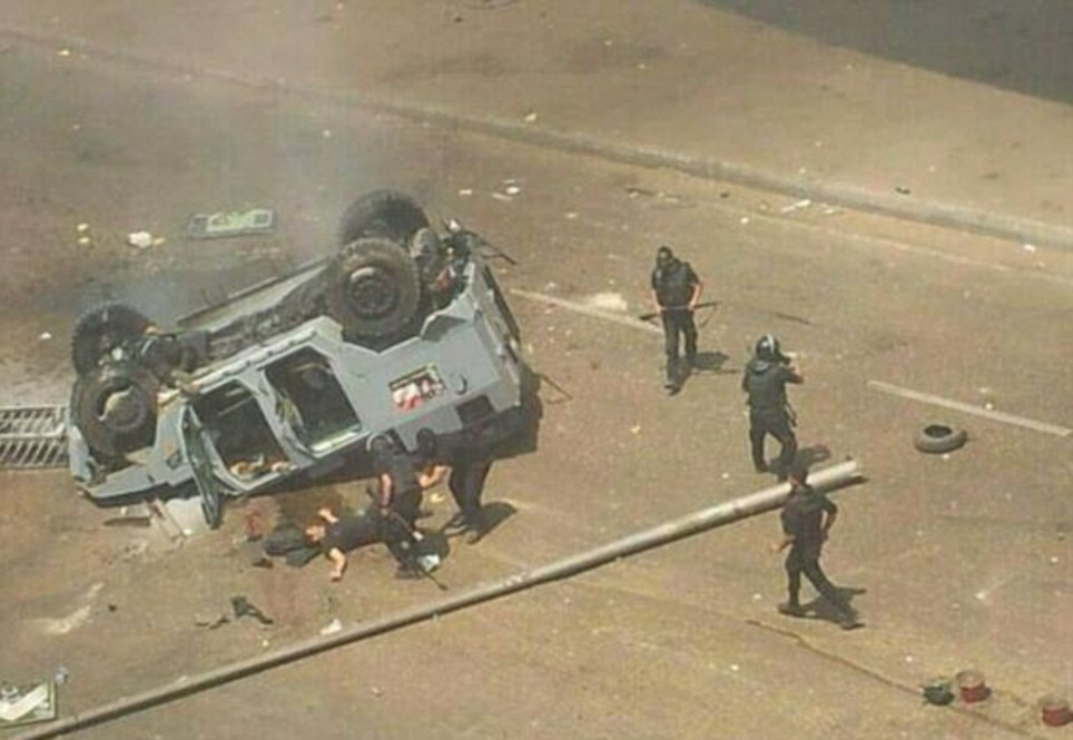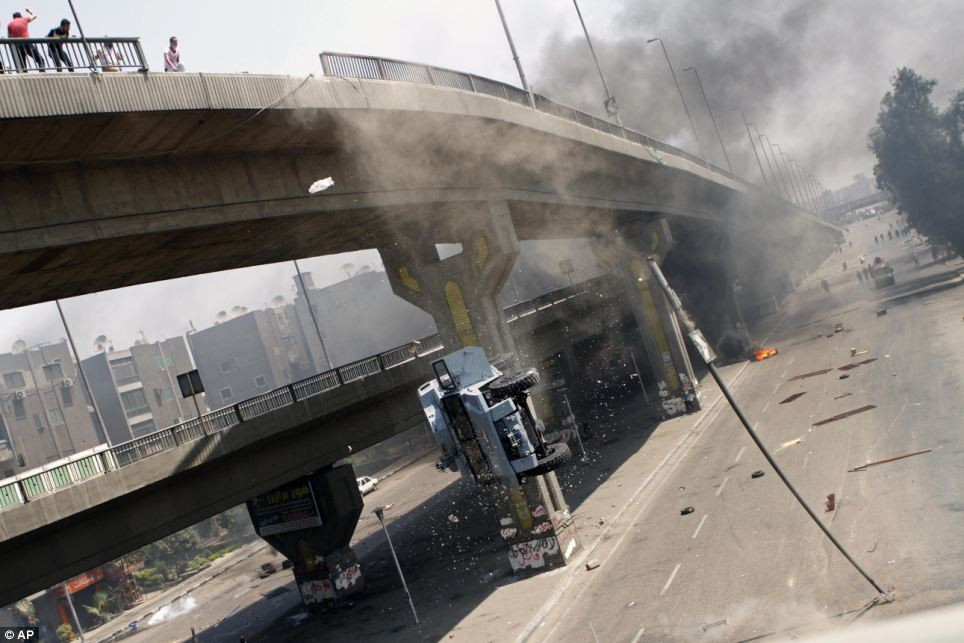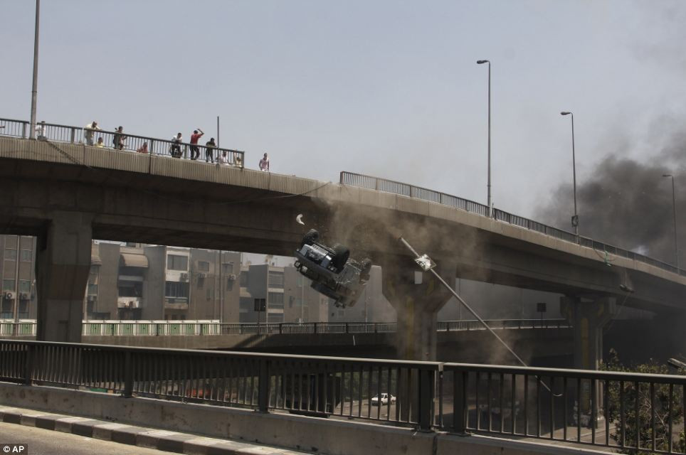 TPO–Đám đông phục kích rồi thẳng tay hất chiếc xe bọc thép của cảnh sát bay khỏi cây cầu vượt ở Thủ đô Cairo hôm qua 14/8 -một trong những khoảnh khắc cho thấy sự khốc liệt của bạo động diễn ra tại Ai Cập.