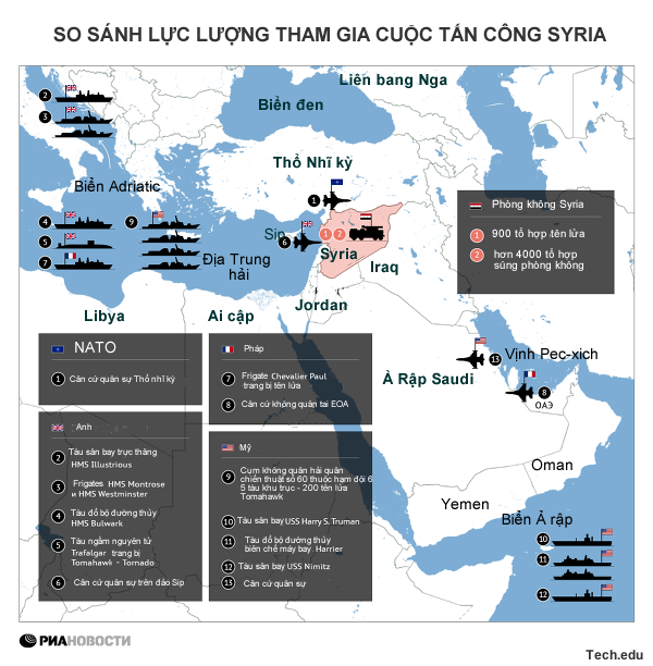 Hiện nay ở vùng nước phía đông Địa Trung hải đang có 5 khu trục hạm tên lửa của Mỹ: USS Stout, Mahan, Ramage, Barry, Gravely. Mỗi khu trục hạm có thể mang theo 90 tên lửa, nhưng theo các chuyên gia, một nửa số tên lửa đó dùng để phòng thủ. Như vậy, 5 tàu khu trục mang tên lửa có khả năng tấn công các mục tiêu ở Syria hơn 200 tên lửa Tomahawk. Ngoài ra, trong khu vực đã triển hai hai cụm ACTF (không quân hải quân tấn công chủ lực) với các kỳ hạm là tàu sân bay nguyên tử Harry S. Truman và Nimitz. Để thực hiện hành động quân sự can thiệp vào Syria, tổng thống Barack Obama muốn nhận được sự ủng hộ và phê chuẩn của Quốc hội cho chiến dịch.