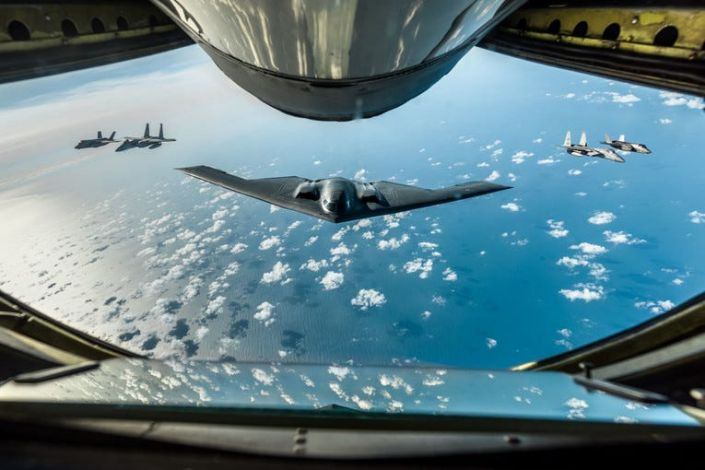 Một máy bay ném bom B-2 Spirit, hai chiếc F-35 Lightning II và hai chiếc F-15 bay theo đội hình phía sau một chiếc Stratotanker KC-135 trong nhiệm vụ huấn luyện ở Anh, ngày 16/9.