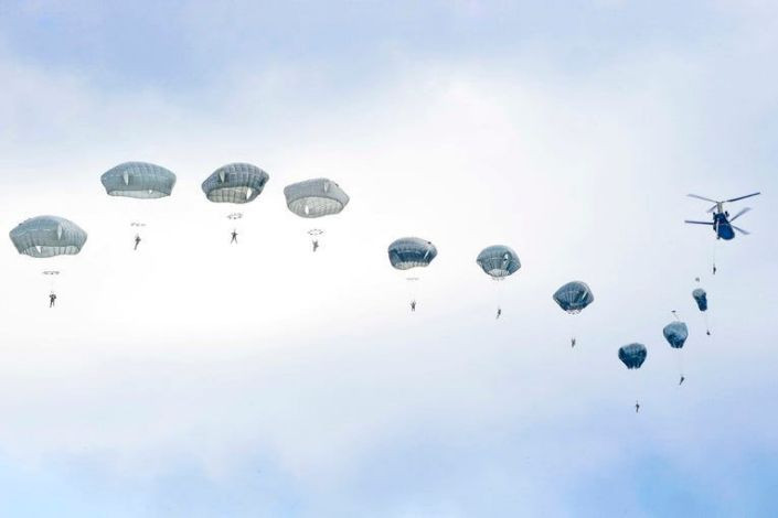 Lính nhảy dù nhảy từ một chiếc trực thăng CH-47 Chinook tại Khu huấn luyện Grafenwoehr, Đức ngày 14/8.