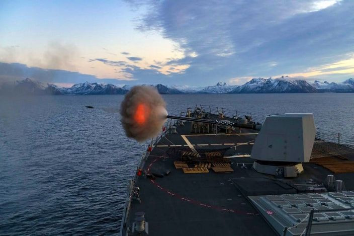 Tàu khu trục tên lửa dẫn đường USS Gridley (DDG 101) khai hỏa khẩu súng 5 inch Mark 45 của mình trong cuộc tập trận bắn đạn thật ở biển Na Uy vào ngày 22/ 11/2019.