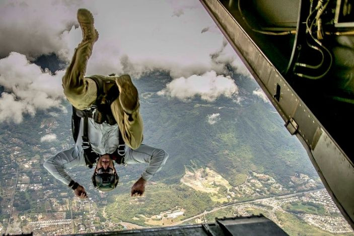 Một binh sĩ nhảy ra khỏi chiếc MV-22B Osprey của lực lượng thủy quân lục chiến trong quá trình huấn luyện nhảy dù tại Hawaii, ngày 13/8.