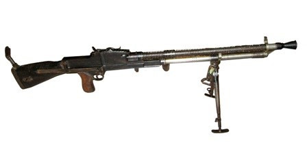 Cùng với chiếc bút, tấm huân chương được trưng bày, Bảo tàng Lịch sử quân sự Việt Nam còn lưu giữ kỷ vật khác liên quan đến Anh hùng Bế Văn Đàn, đó là khẩu súng trung liên mà anh nguyện lấy thân mình làm giá súng.