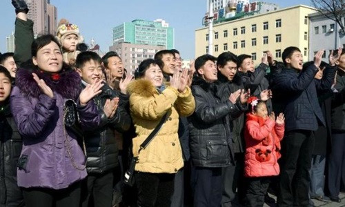 Người dân Bình Nhưỡng vui mừng khi xem bản tin trên một màn hình lớn thông báo về việc Triều Tiên phóng thành công vệ tinh lên quỹ đạo. Ảnh: Reuters
