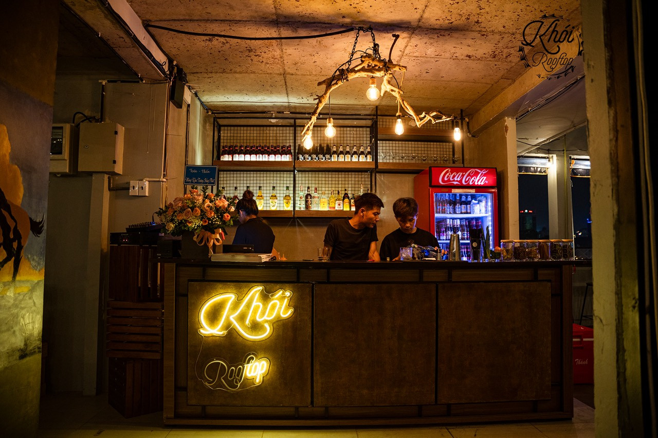 Khói nằm ở trên lầu 6 của một tòa nhà cao tầng. Bạn bấm thang máy lên tới lầu 5, chịu khó leo lên thêm một lầu nữa là nhìn thấy biển hiệu Khói Rooftop. Khói được décor mộc mạc, giản đơn như chính tên gọi của nó.