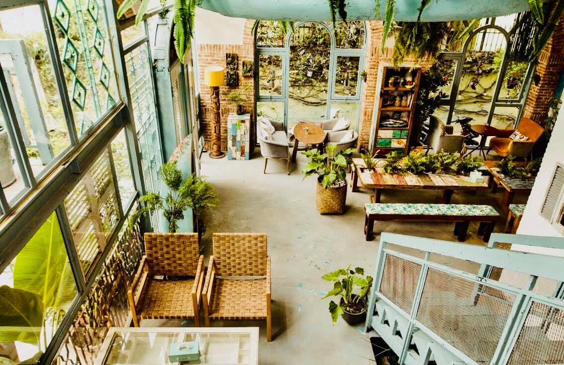 Không gian xanh mát trải khắp, đặc biệt gây ấn tượng là hàng cây xương rồng được trồng sát tường tạo cảm giác mát dịu. Tiệm có dãy bàn ghế dài cho những nhóm bạn tầm 5 - 10 người và có hẳn một background xịn sò với những ô cửa sổ vintage màu xanh độc đáo hệt như một góc trời Âu thu nhỏ. Nếu mê chụp hình, bạn sẽ chẳng gặp chút khó khăn nào đâu vì tiệm có vô vàn góc sống ảo “triệu like”. Bạn có thể đi vào buổi sáng để có những bức hình đón nắng sớm hoặc tầm chiều mát. Thực đơn của tiệm khá healthy với trà trái cây tươi mix đủ vị, giá tầm 30 - 60K/ phần.