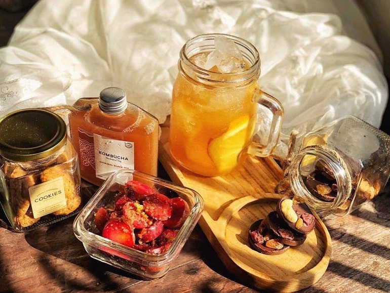 Nếu bạn đã quen với thói quen ăn uống healthy, hẳn bạn sẽ không thể ngó lơ món Kombucha quen thuộc. Kombucha của tiệm được chế biến hoàn toàn thủ công từ con giấm Scoby, trà đen và đường mía. Bạn có thể chọn Kombucha Spiced Apple với vị táo đỏ đậm đà và vị hoa hồi cay cay cùng một chút hương hoa đậu biếc thanh mát; hoặc Kombucha Clamansi với vị gừng the mát và vị tắc chua chua ngọt ngọt, hoặc Kombucha Mary Berry với vị chua ngọt đặc trưng của phúc bồn tử tươi cùng với vị ngọt thanh của chanh dây, thêm một chút hương thảo nồng nàn. Các món smoothies, bánh mì nguyên cám, bánh mì Fruit&Nuts và bánh mì Than tre cũng hấp dẫn vô cùng.