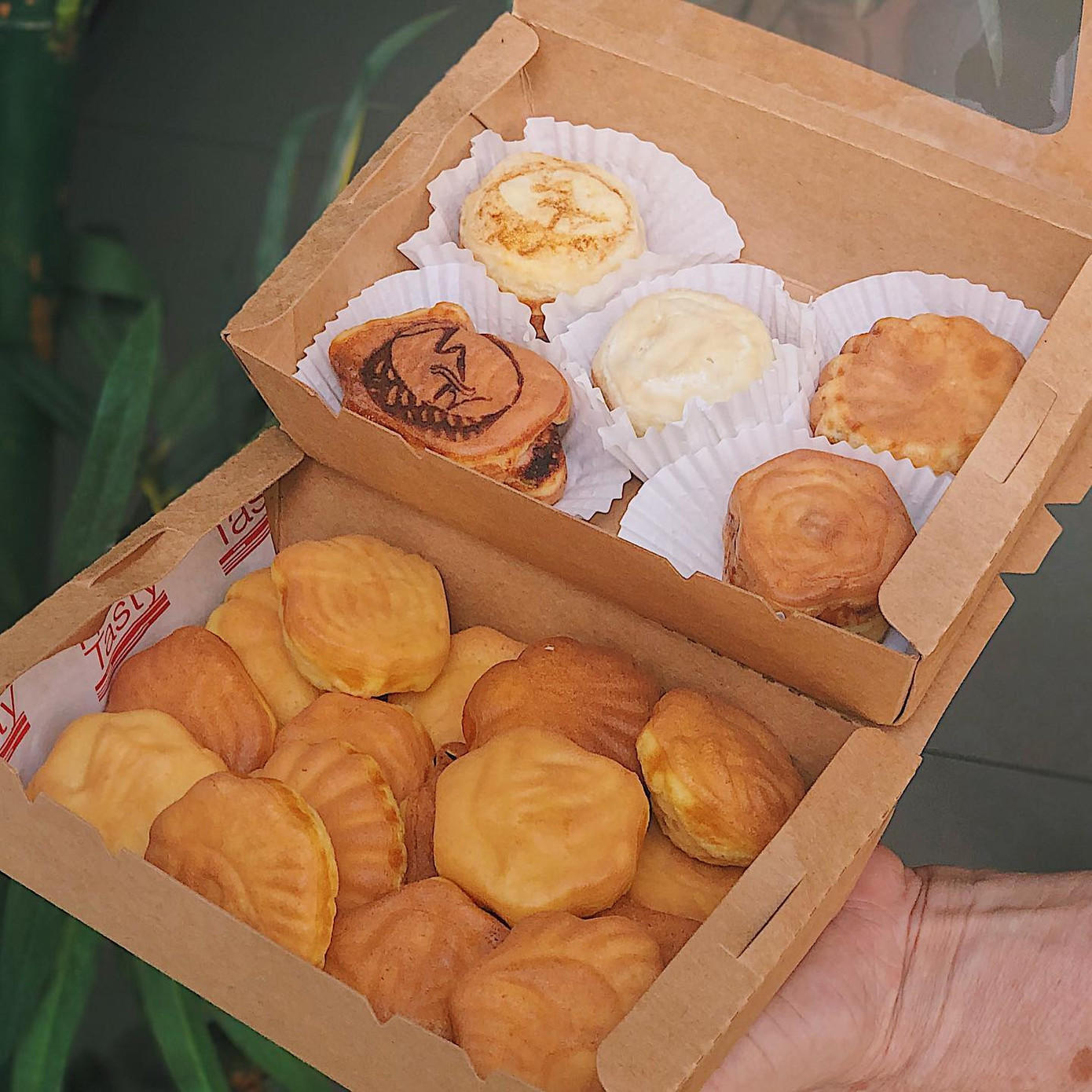 Bánh bò nướng vốn là món ăn vặt tuổi thơ của teen Sài thành bao thế hệ, nhưng bánh bò chấm sốt thì không phải nơi nào cũng có. Hộp bánh bò nướng mini chấm với 2 loại sốt: Cốt dừa, dứa và sốt bơ ngon khó cưỡng. Giá một hộp 16 bánh là 50K, vị dừa dứa thơm dịu, ngọt thanh còn vị sốt bơ thì béo béo bùi bùi chấm cùng bánh bò nướng ăn rất dậy vị.