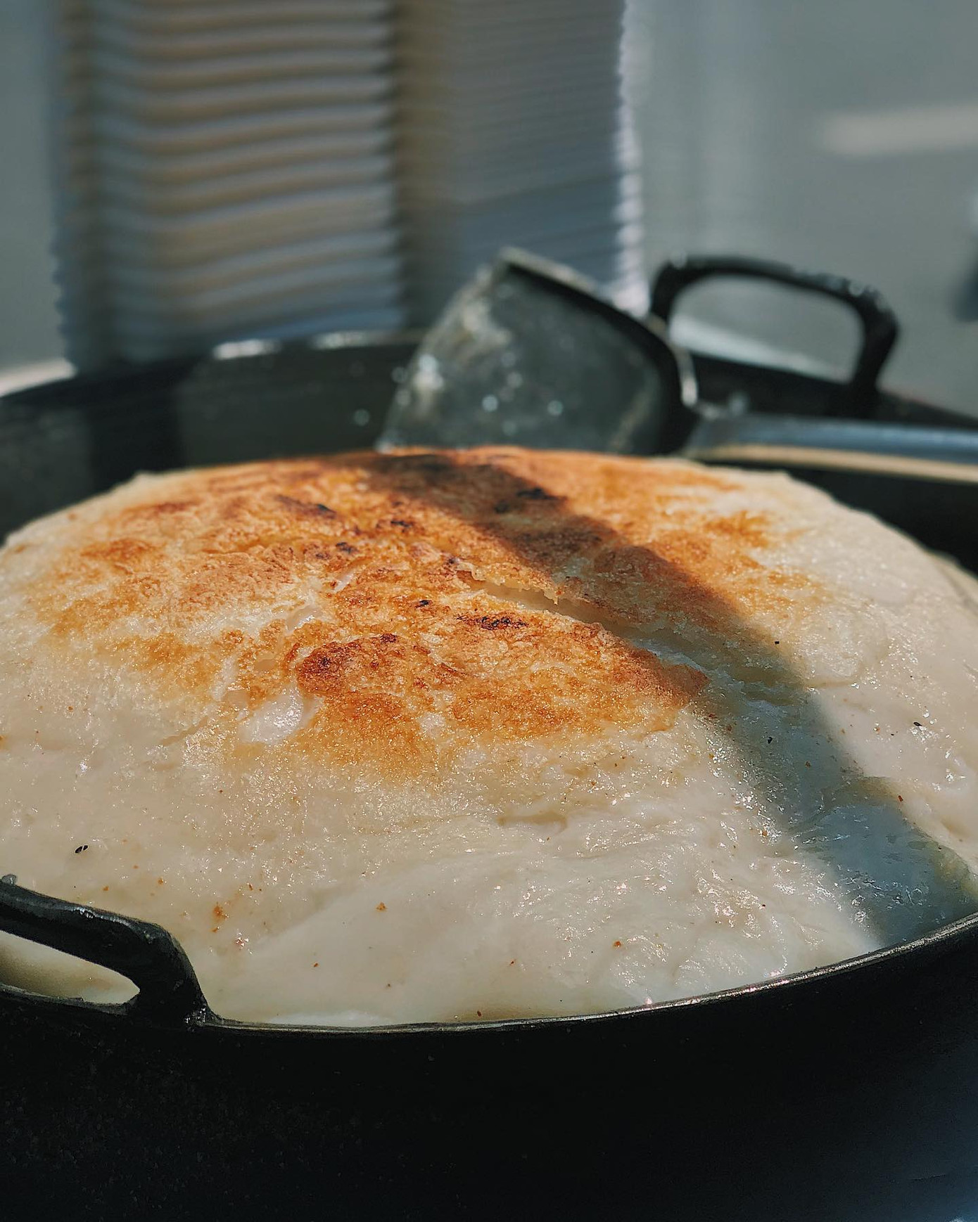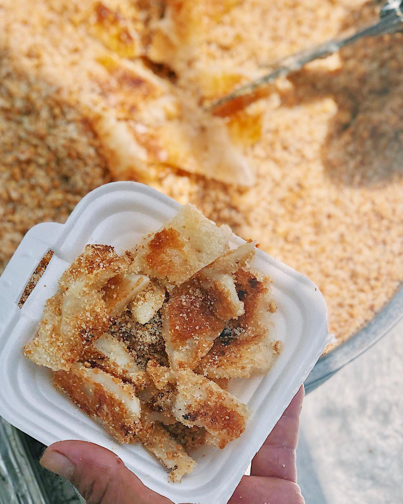 Đây là món ăn truyền thống của người Triều Châu, nhìn có vẻ xuề xòa, đơn giản ấy vậy mà ăn một miếng là ghiền. Bánh làm từ bột nếp, được xào nấu trên chiếc chảo lòng sâu và cứ thế khi phần bột cháy vàng ươm thì cắt miếng lăn qua đậu phộng đường hay mè đen đường.
