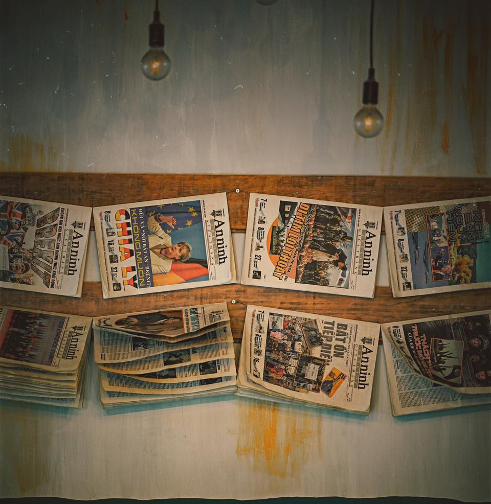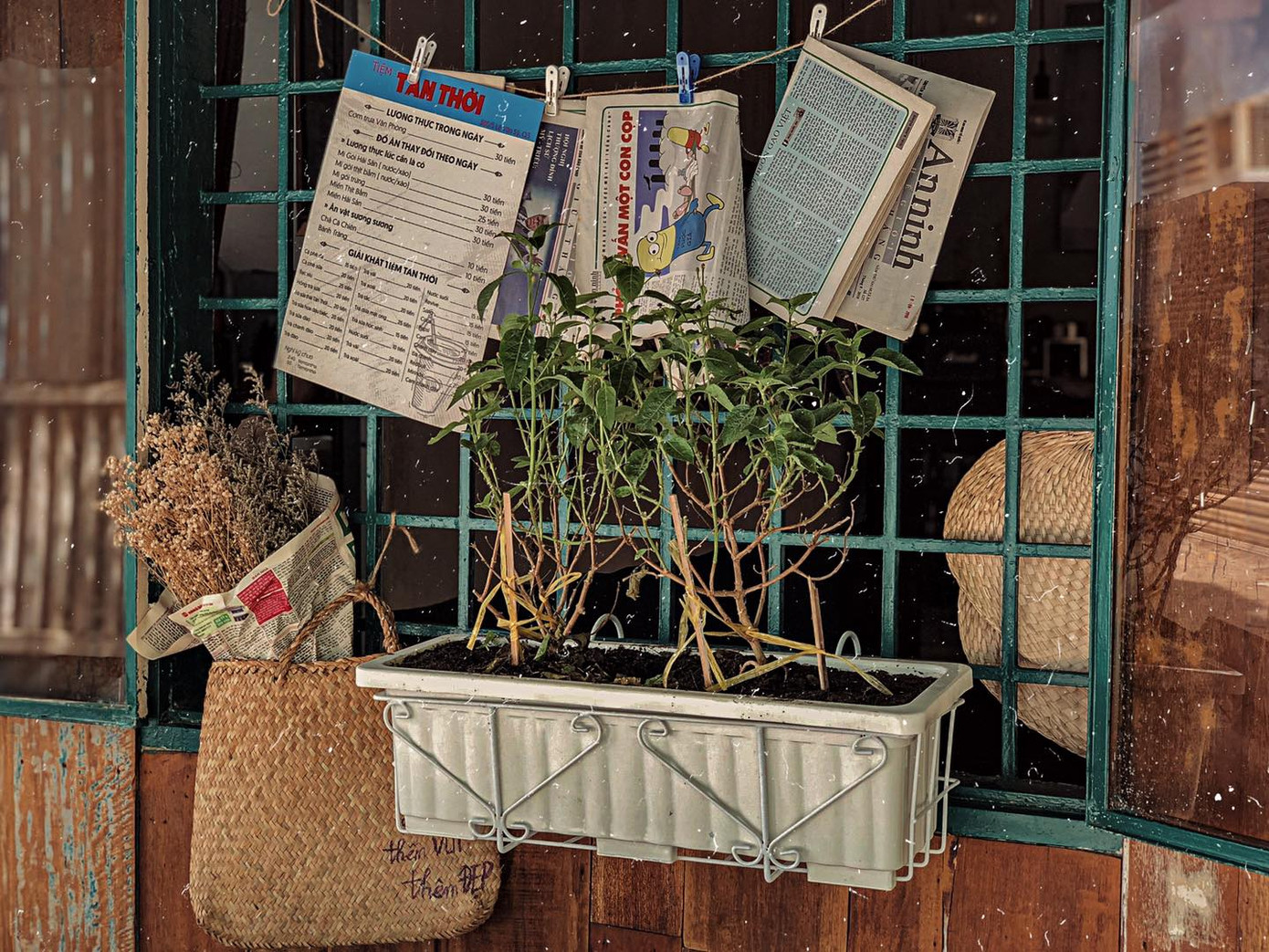 Lời mời chào vô cùng giản dị và đáng yêu của bổn tiệm cũng đúng với phong cách hành văn của người Sài Gòn xưa. Cửa tiệm nhỏ xíu xiu như ki-ốt bán báo, không tiện nghi nhưng được décor theo phong cách retro vô cùng ấn tượng và bắt mắt: Mái tôn sơn xanh nô và ánh đèn vàng dìu dịu, trường nhà xù xì mộc mạc, bộ bàn ghế gỗ nhỏ bé và đơn sơ, chiếc radio cũ kĩ, một bức tường được trưng dụng để bày trí những tờ báo xưa…
