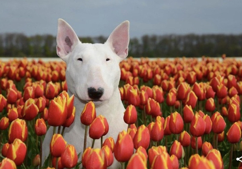 Với khuôn mặt đặc trưng của giống chó Bull Terrier, từ trán xuống mũi rất phẳng, thuôn đều từ trán xuống mũi, đôi mắt híp bé xíu trong rất khác lạ và bộ lông màu trắng sát da nên Claire luôn nổi bật giữa rừng hoa. Bất kể là hoa gì, tulip, oải hương, cúc... đều chỉ làm nền cho em ý mà thôi.