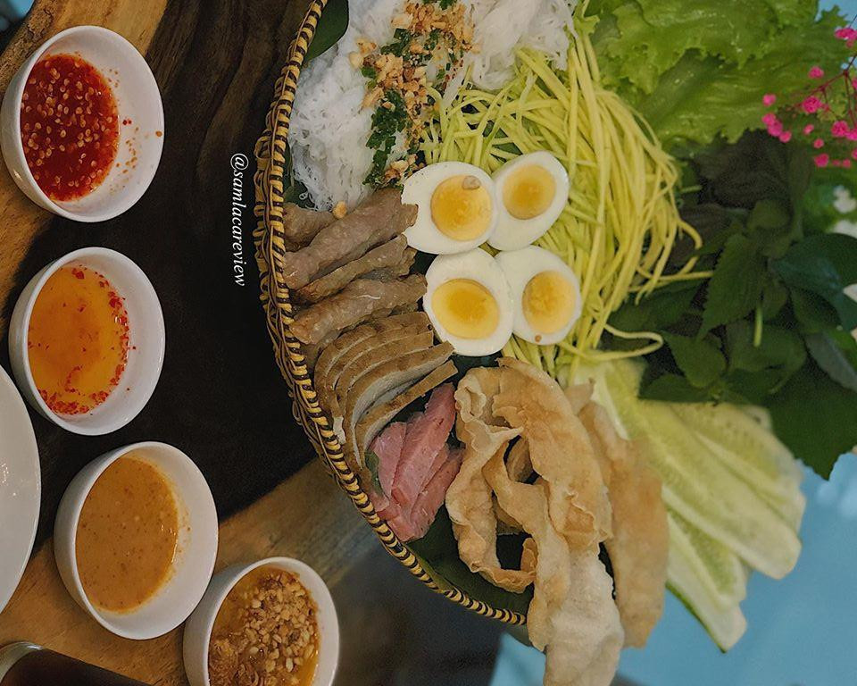 Ảnh: Sam Nguyễn Ghé ngay: Nắng - Nem nướng Nha Trang, số 17 Đường 45, Bình Trưng Tây, Quận 2 (sau lưng bệnh viện 2), TP.HCM. Giá: 49K/ người, một mẹt đầy đủ tầm 145K là hai người ăn no căng bụng. Tiệm mở cửa từ 6 giờ sáng đến 8 giờ tối là hết sạch nem. Thi thoảng, tiệm có chương trình giảm giá, giảm 30K/ mẹt 2 người ăn.
