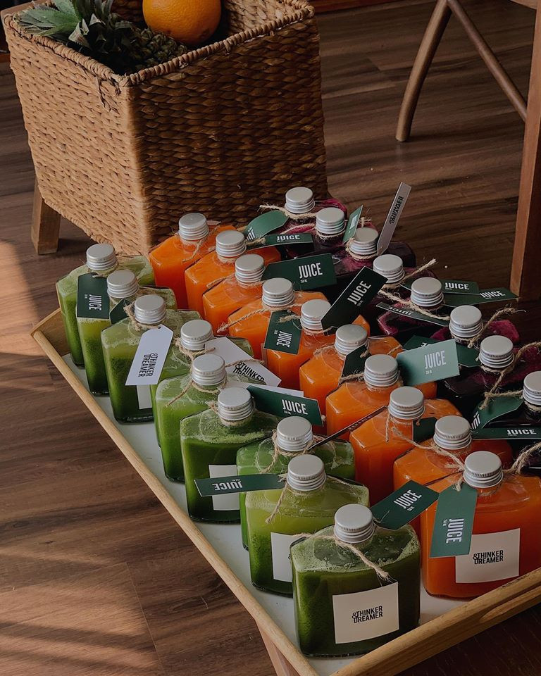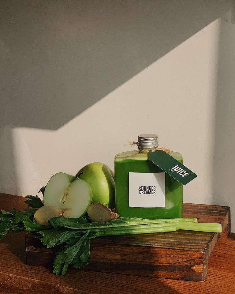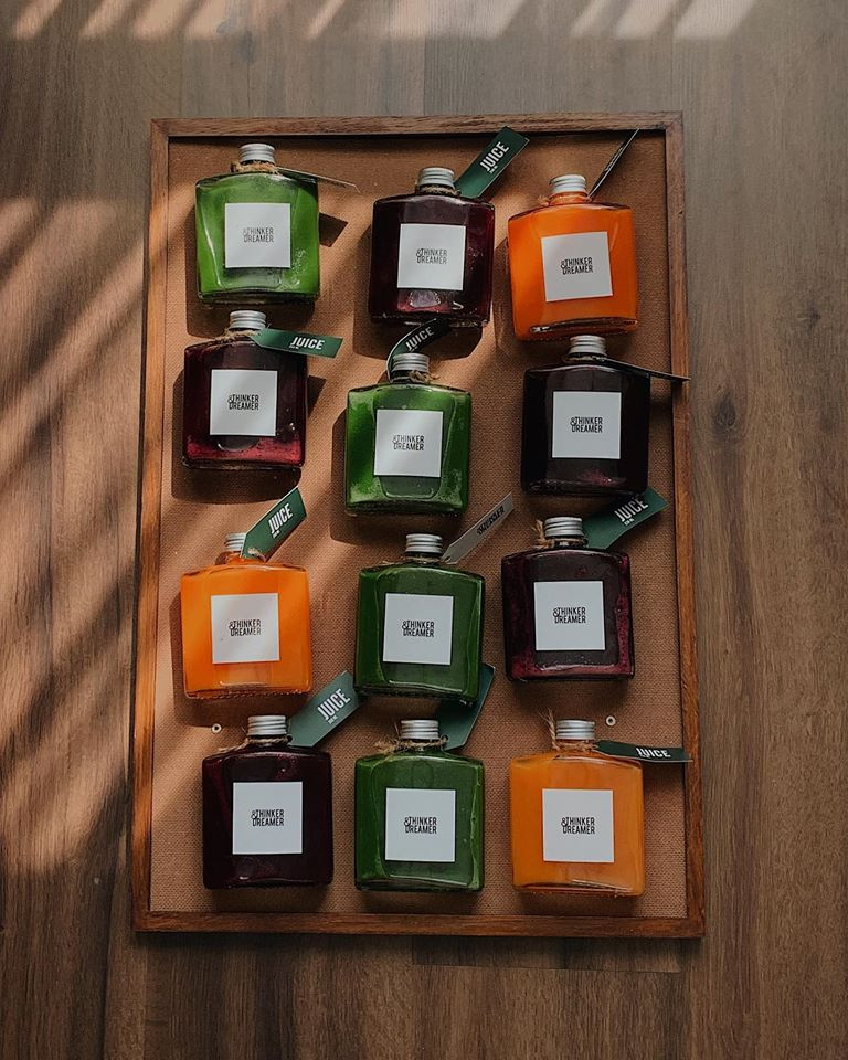 Khác với rất nhiều những quán cà phê khác, Thinker&Dreamer gần như chỉ tập trung vào chăm chút cho dòng nước ép trái cây hữu cơ detox đa sắc và healthy như cam ép, củ dền ép, cam mix cà rốt ép, táo xanh ép, củ dền - cần tây - táo xanh - chanh ép,… Các món nước được gọi tên theo màu sắc. Như món nước Green, Thinker&Dreamer chọn nguyên liệu chủ đạo là cần tây và chút cải bó xôi để tạo màu xanh đậm tràn đầy sức sống. Sau đó sẽ để táo xanh làm vị nền, vừa hòa hợp màu sắc, vừa át bớt vị ngái từ rau. Kế đến là chanh và gừng, 2 loại vị cực đậm vừa kích thích vị giác, vừa cân bằng tất cả các thành phần. Màu sắc của từng nguyên liệu quyết định sự hài hòa sắc độ cho món nước ép, lại còn hỗ trợ lẫn nhau trong việc bổ sung dưỡng chất cho cơ thể.