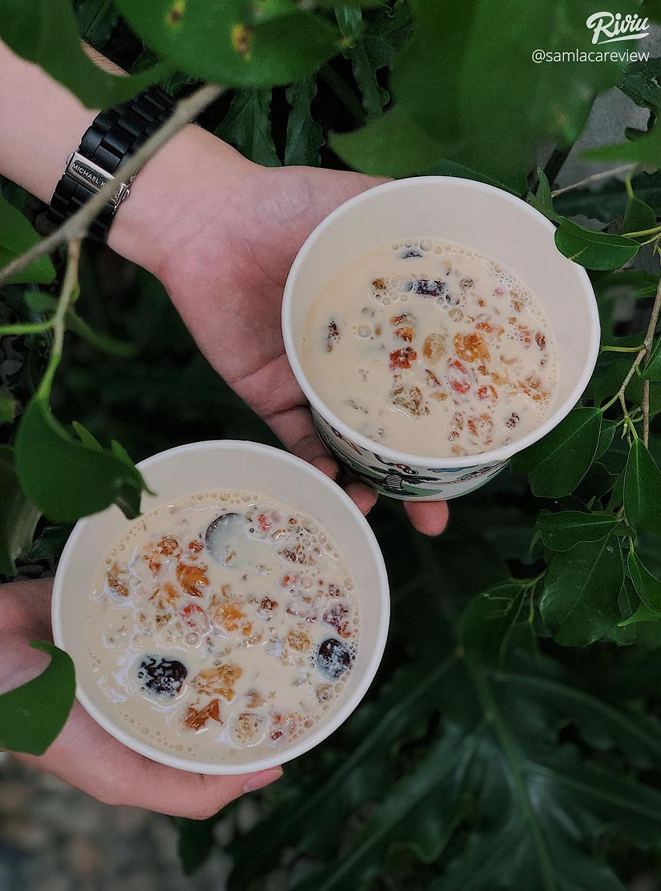 Bạn có thể gọi thêm chè nhựa đào Hồng Kông để ăn cùng, giá 60K/ phần: Vừa dưỡng nhan, vừa tốt cho sức khỏe với nhựa đào giàu collagen tiềm cùng đường phèn, sữa tươi Hong Kong với kỷ tử (bổ mắt), táo tàu (bổ máu).