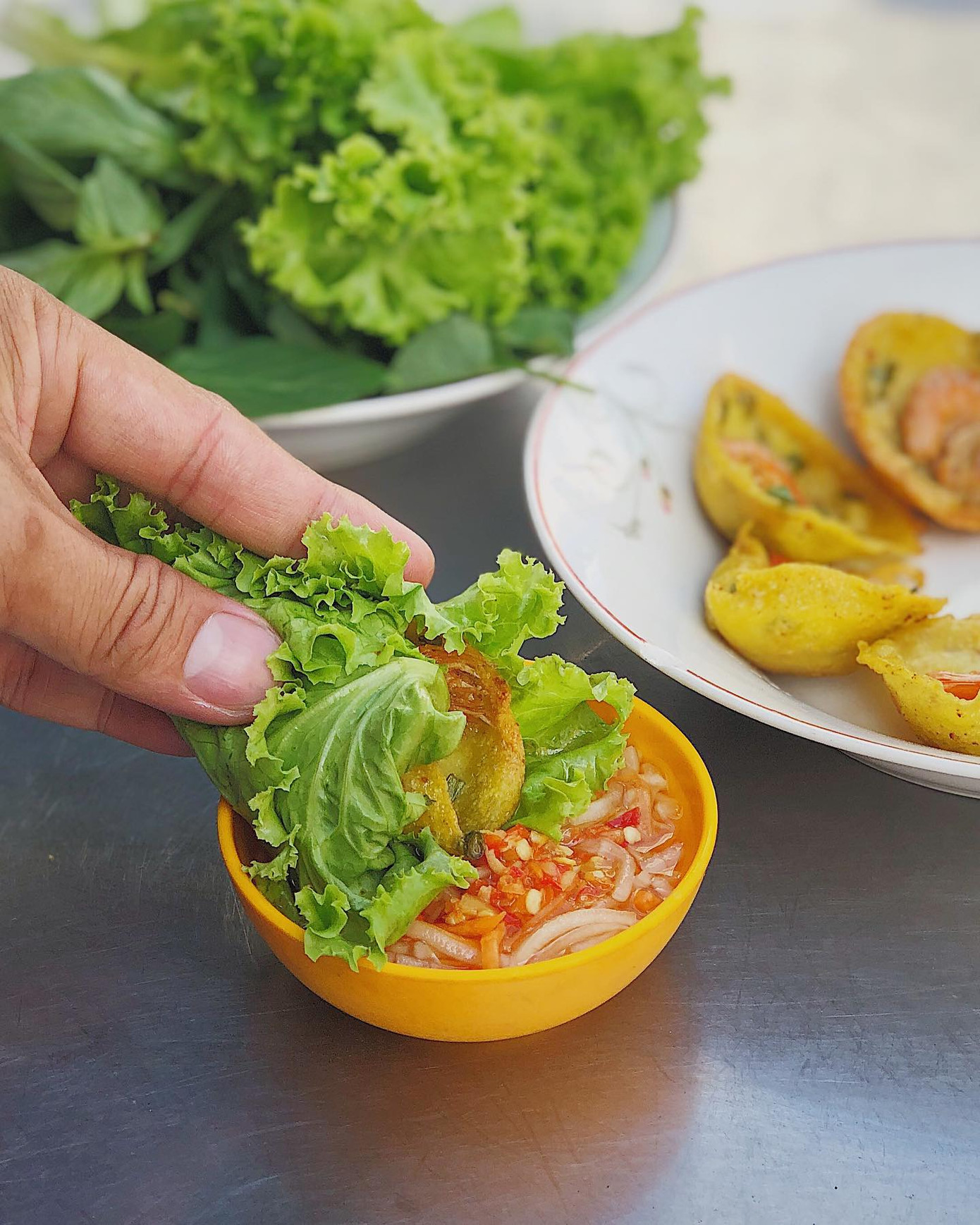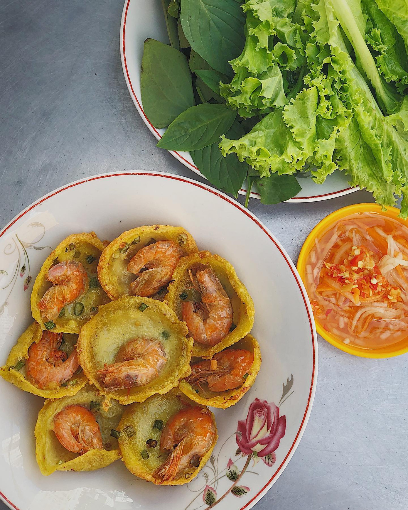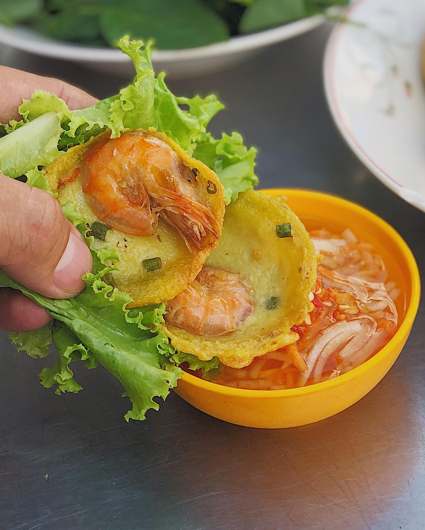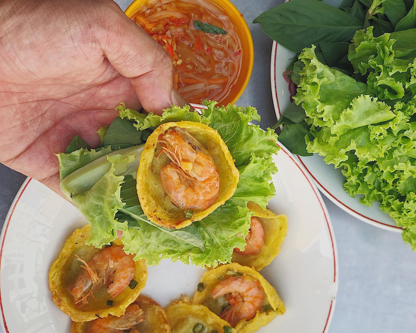 Bán khọt "mini", nằm trọn trong lòng bàn tay với lớp áo bột dẻo dẻo, thơm bùi và nhân tôm tươi ngon "bá cháy". Bánh được chiên vừa tới để lớp ngoài vàng ươm, giòn tan còn lớp bên trong vẫn giữ được độ mềm. Tôm nhỏ thôi nhưng chắc thịt. Bánh khọt cuốn với rau sống, chấm nước mắm chua ngọt, thêm miếng đu đủ và cà-rốt bào sợi nữa là hoàn hảo nha!
