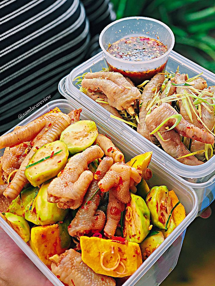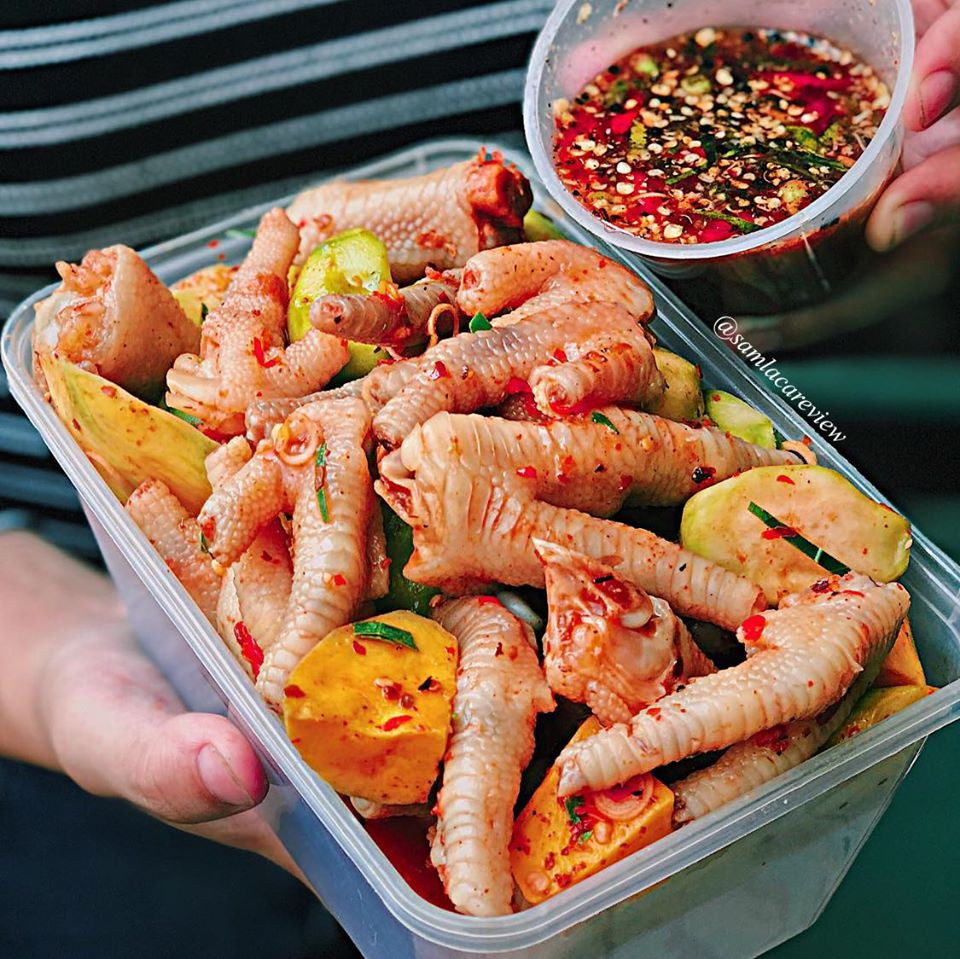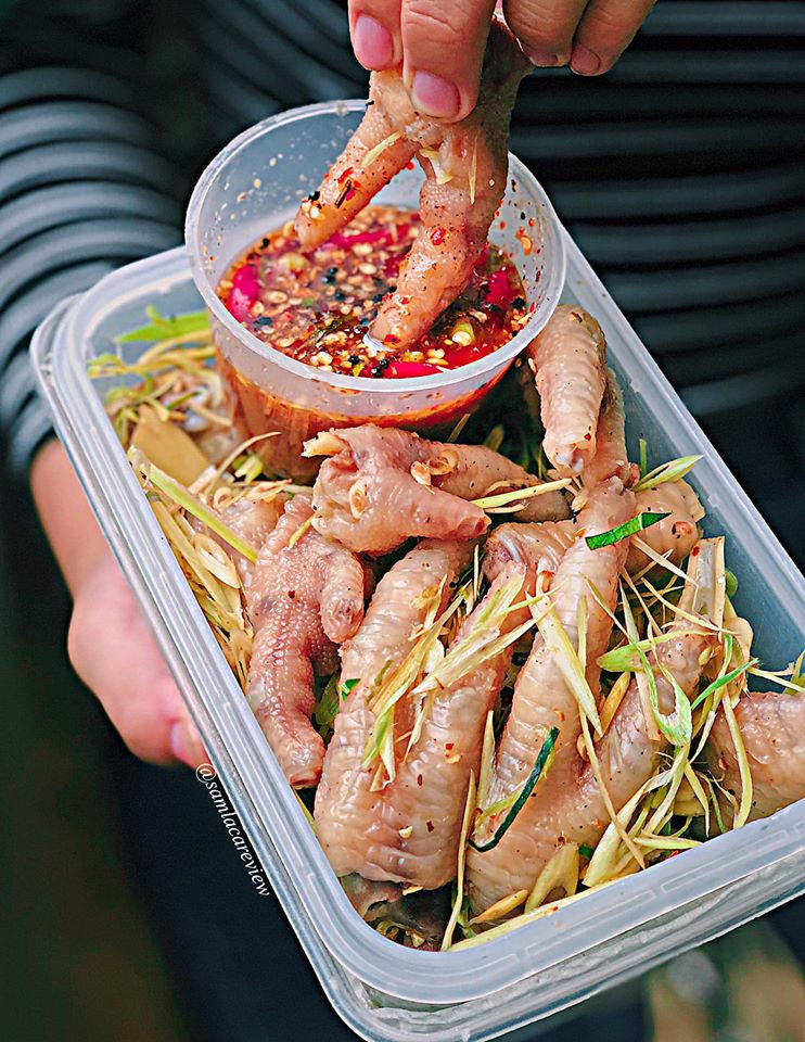 Món này ăn lai rai mùa nắng cực hợp. Chân gà ngâm sả tắc, chân gà sốt Thái chua cay ăn kèm cóc, xoài là bao ghiền. Nếu bạn thích gặm chân gà ngập răng, thì đây chính là lựa chọn hoàn hảo. Những chiếc chân gà bự bành ki, múp ma múp míp được làm sạch sẽ, trộn sả tắc hoặc sốt Thái, hương vị đậm đà, da và gân gà giòn sừn sựt, nước sốt tặng kèm cũng xuất sắc nữa. Cứ ở nhà, order chân gà về gặm lai rai tránh nóng là hết ý!