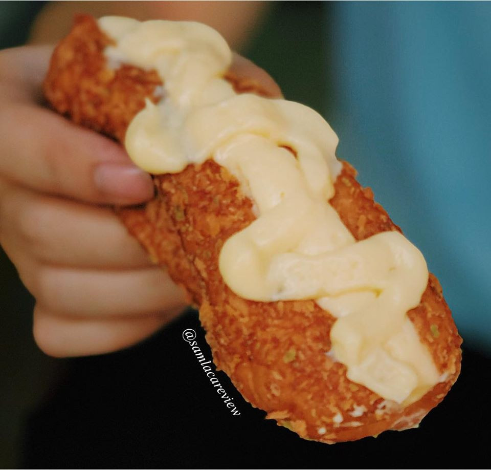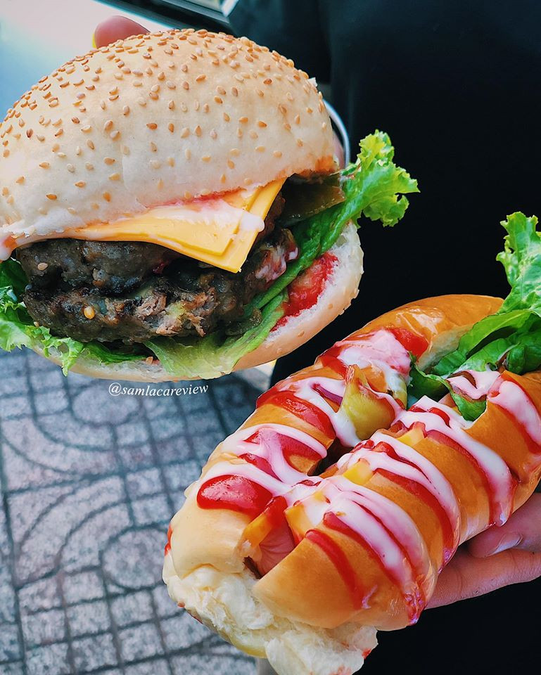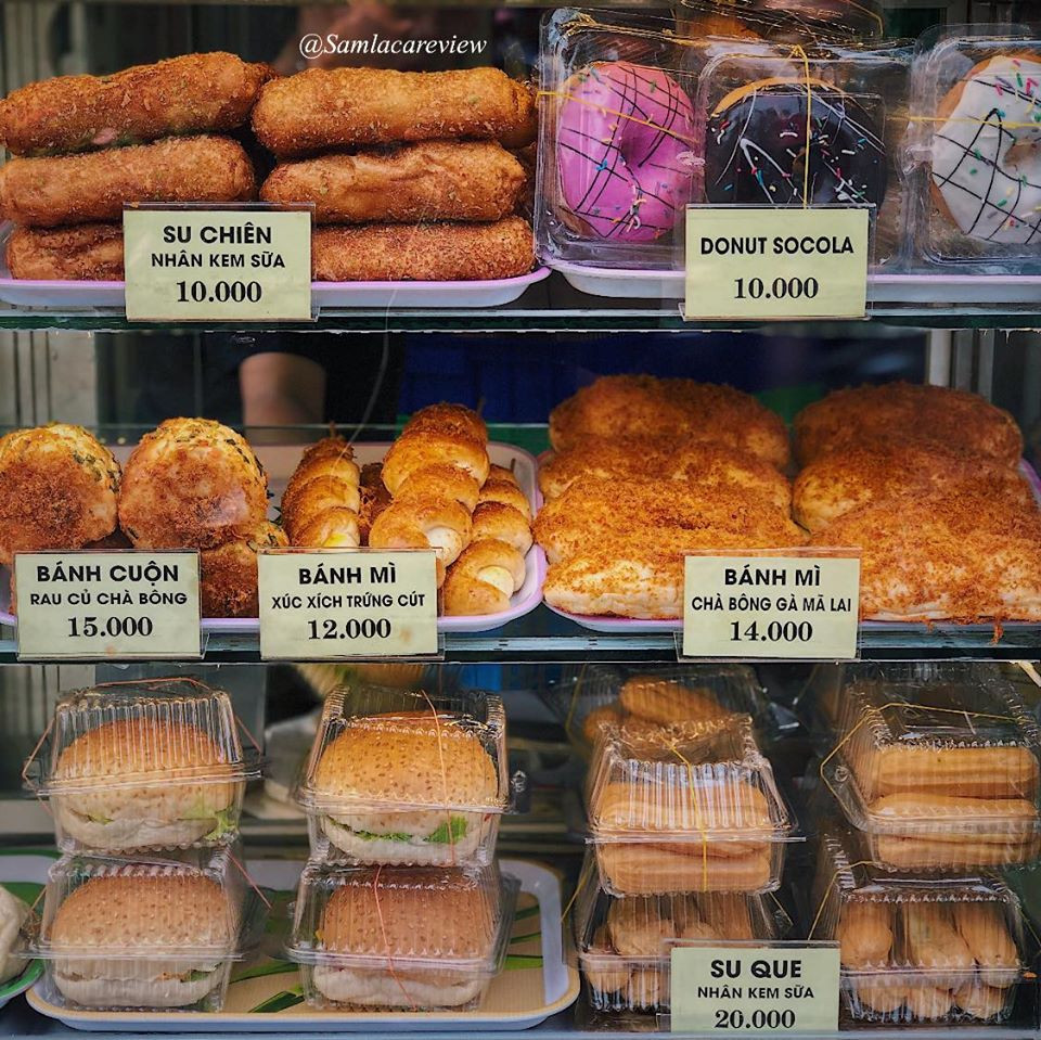 Thực đơn phong phú, tha hồ cho bạn lựa chọn, từ bánh su chiên kem sữa, chà bông gà Mã Lai, su que, bánh mì kem phô-mai, hamburger, bánh vòng donut… Bánh được làm mới trong ngày, ăn là biết ngay. Hamburger bình thường là 20K, nếu bạn kêu gấp đôi thịt bò thì giá cũng chỉ có 35K. Nếu bạn thuộc team mê hotdog, ăn kèm bánh mì thì nên ghé đây; thêm sốt cà, xà lách, phô mai mà giá cũng chỉ 15K. Donut truyền thống cũng nên thử lắm, giá 10K/ bé nghen!
