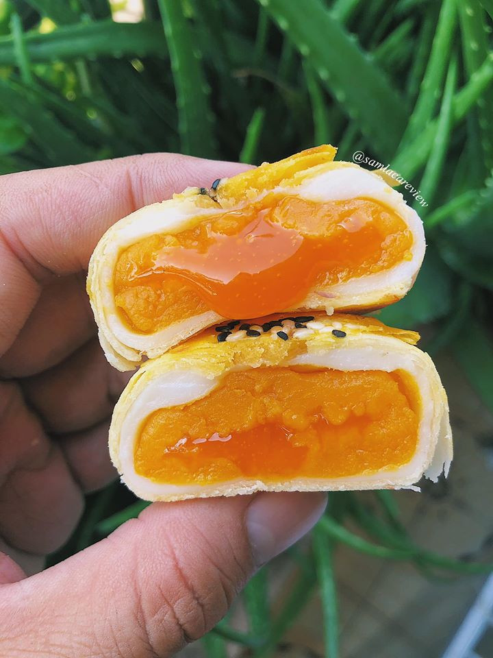 Lớp vỏ ngoài cùng của bánh mềm thơm, đưa vào miệng là tan. Lớp kế tiếp dẻo dẻo như bánh mochi nhưng béo hơn một chút, trong cùng là nhân trứng muối béo-bùi-ngậy và tan chảy. Giá 120K/ hộp 6 bánh.