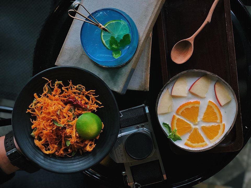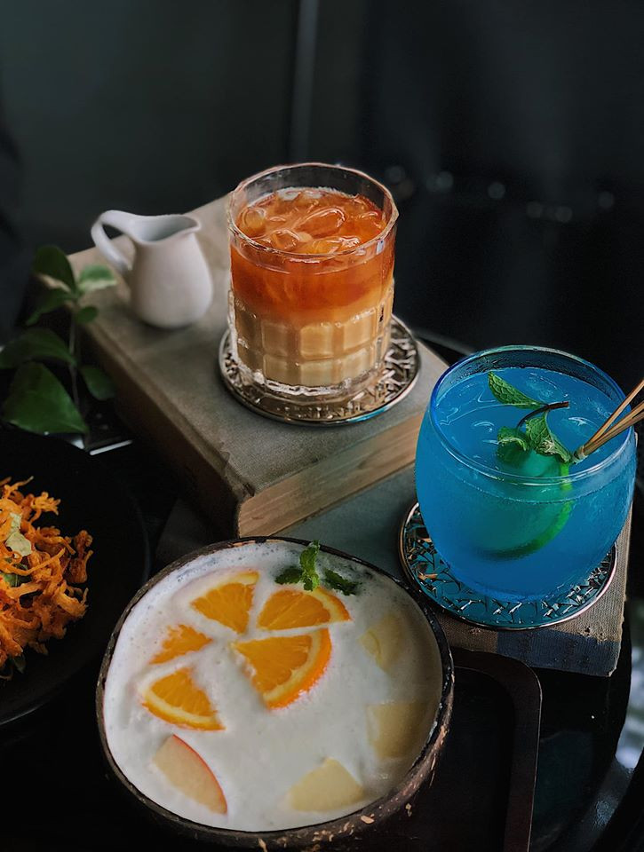 Thực đơn nước uống cũng khá đa dạng, từ 25 - 50K. Gu bình dân thì có trà, cà phê; “sành điệu” hơn thì các loại nước pha chế nhé! Món Bluesky màu xanh trời mát mắt, Yogurt Kamegara đựng trong “ly” gáo dừa cool ngầu, Cold Brew with Milk với vị cà phê lạnh nhè nhẹ không quá hăng.