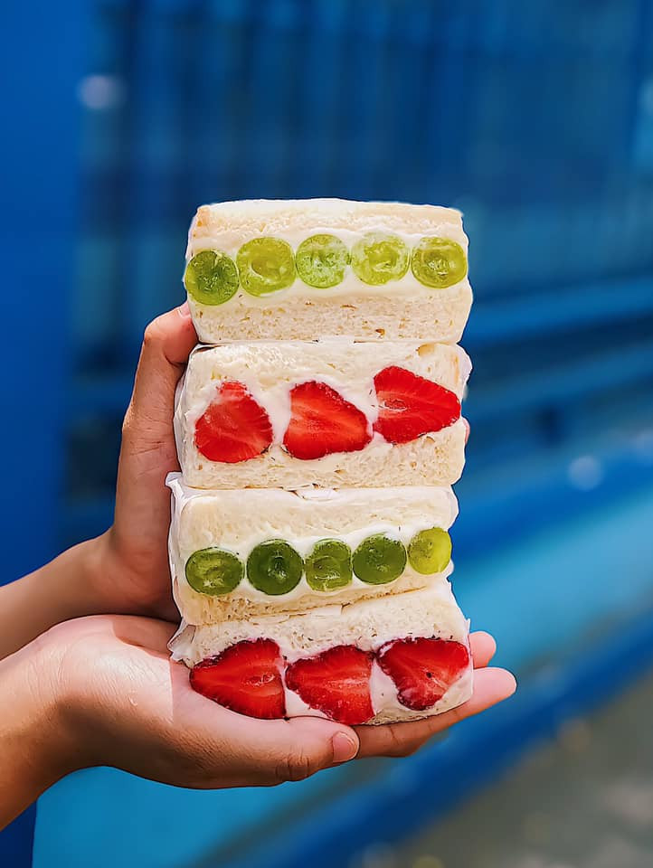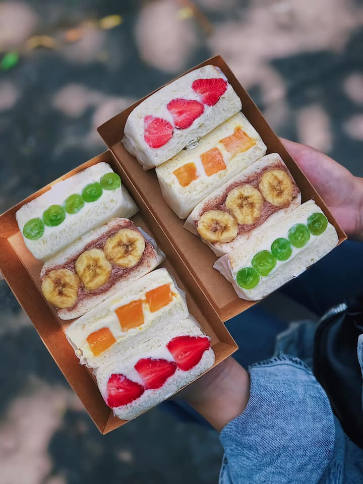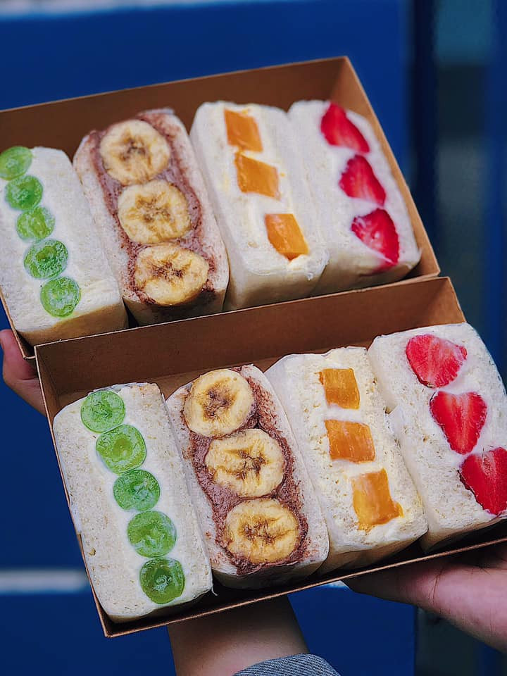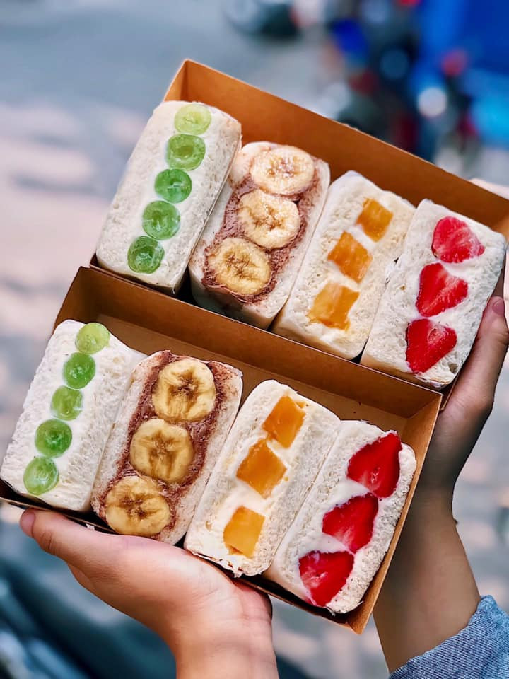 Món sandwich trái cây cream cheese vốn rất hot bên Đài nay đã “du nhập” về Việt Nam. Một hộp gồm 4 loại sandwich trái cây nhìn xịn lắm: Vỏ bánh sandwich mềm xốp, ăn cùng lớp kem phô mai (cream cheese) béo mặn nhè nhẹ nên ăn hoài không ngán; nhân bánh có rất loại trái cây: Dâu, nho, xoài, còn lại là sốt cacao với chuối. Bánh sẽ ăn ngon hơn khi để lạnh. Giá cả khá mềm: Chỉ từ 20K.
