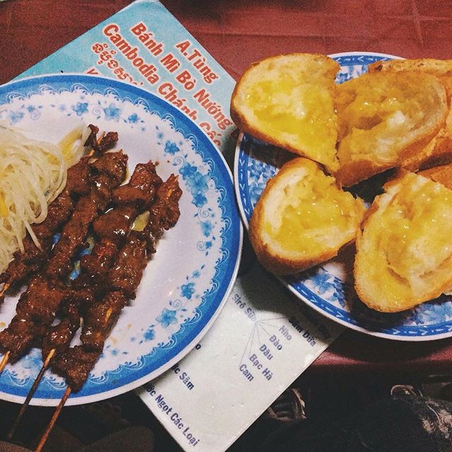 Bánh mỳ bò nướng vốn đã thơm ngon, chế biến theo kiểu Campuchia lại thêm phần hấp dẫn. Thịt bò được cắt lát, tẩm các loại gia vị truyền thống của người Campuchia, để khoảng 2-3 tiếng trong nhiệt độ thường, sau đó nướng trên lửa than. Khi thịt bò gần chín, người nướng quét một lớp bơ mỏng, nướng thêm khoảng 30 giây cho bơ phủ đều thịt. Thịt bò nướng ăn kèm đu đủ bào ngâm chua ngọt.