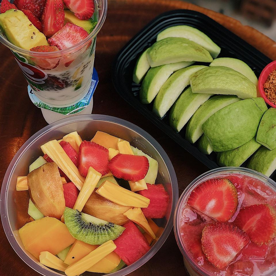 Tiệm cũng bán trái cây tươi. Bạn có thể kêu một tô trái cây to bự chà bá lửa tầm 2 người ăn, thêm 1 hũ sữa chua nữa, thêm đá nữa là có ngay tô trái cây sữa chua mát lạnh giải nhiệt. Bạn cũng có thể gọi một ly trà sữa trái cây mix đủ thứ theo sở thích. Nhìn cái ly bé bé mà ăn xong là no nê, giàu vitamin và dinh dưỡng lắm chứ chẳng đùa.