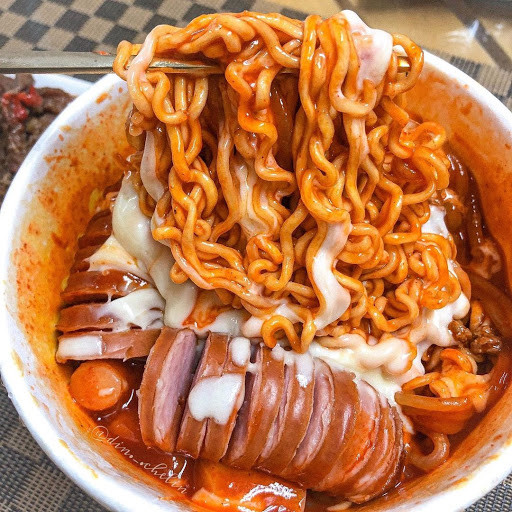 - Cho kimchi vào xào cùng, đảo đều nêm nếm và cho sốt cà chua vào bước cuối. Xào hỗn hợp sốt tới khi vừa chín rồi vớt mì đã luộc vào chảo sốt, trộn đều cho sốt ngấm hết mì. Cuối cùng, rắc thêm phô mai và thưởng thức.