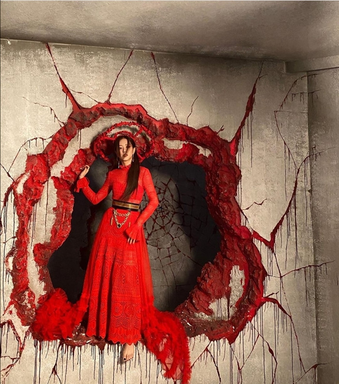 Jisoo từng gấy sốt khi xuất hiện trong MV How You Like That với một chiếc thắt lưng da màu vàng đen và chiếc vương miện đội đầu như một nữ hoàng.