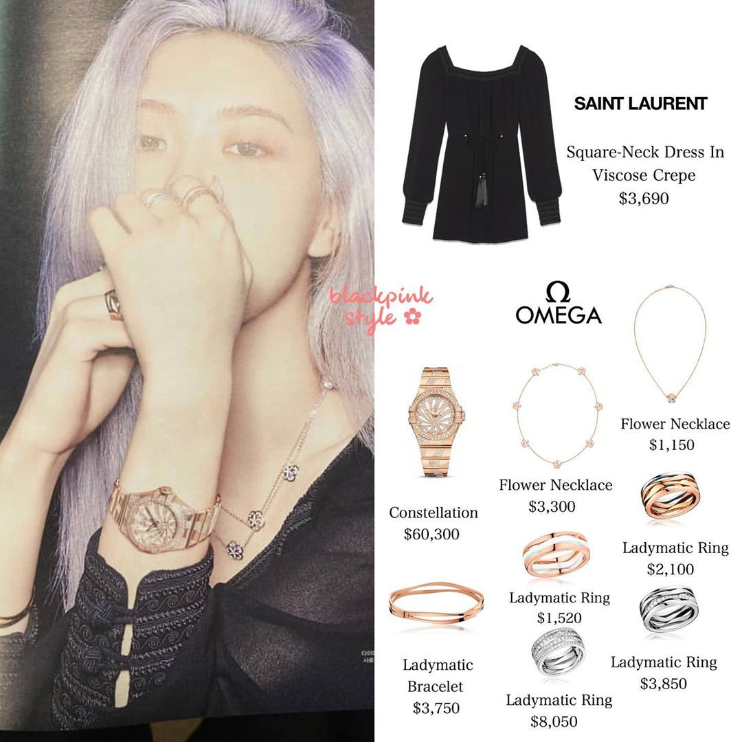 Tiếp tục một set đồ siêu siêu khủng nữa đây! Chỉ riêng chiếc đồng hồ trong ảnh này đã có giá lên tới gần 1,4 tỉ đồng. Ngoài chiếc vòng cổ mảnh mai có giá 26,6 triệu đồng như ở ảnh trước, trong ảnh này Rosé còn đeo thêm một chiếc vòng cổ có giá khoảng 76,5 triệu đồng. Chiếc lắc tay và loạt nhẫn gần như giống với ảnh trước. Cô mặc chiếc váy màu đen thắt eo của Yves Saint Laurent có giá khoảng 85,5 triệu đồng. Nhẩm tính sơ sơ set phụ kiện và trang phục này của Rosé cũng đã lên tới con số 2 tỉ đồng.