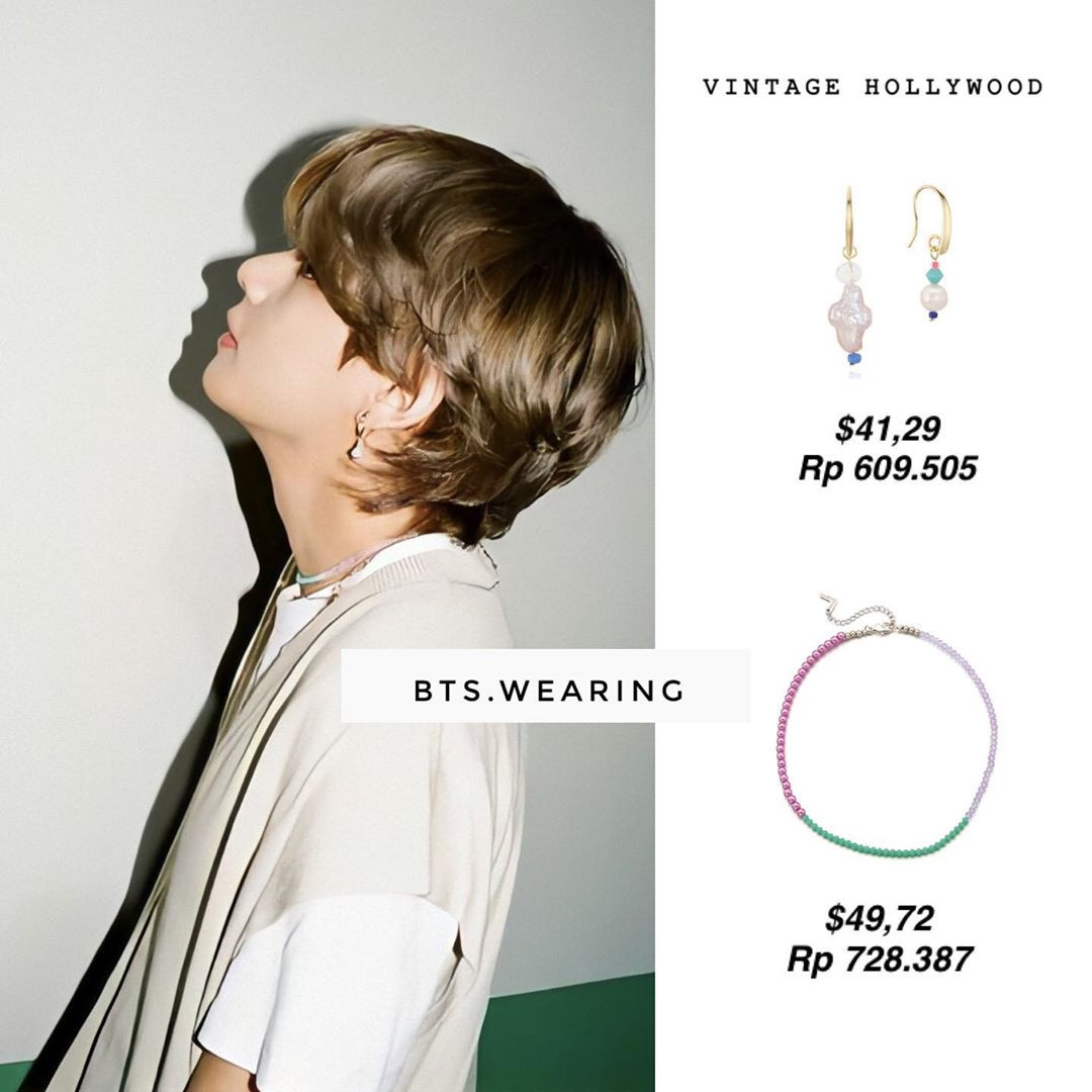 Bộ trang sức V đeo trông rất xinh và đáng yêu, đôi khuyên tai có giá chỉ khoảng hơn 970 ngàn đồng, vòng cổ có giá khoảng 1,1 triệu đồng. Và cũng không ngạc nhiên là bộ trang sức này giờ không thể tìm mua được nữa, vì nó đã "cháy hàng" khắp nơi rồi.